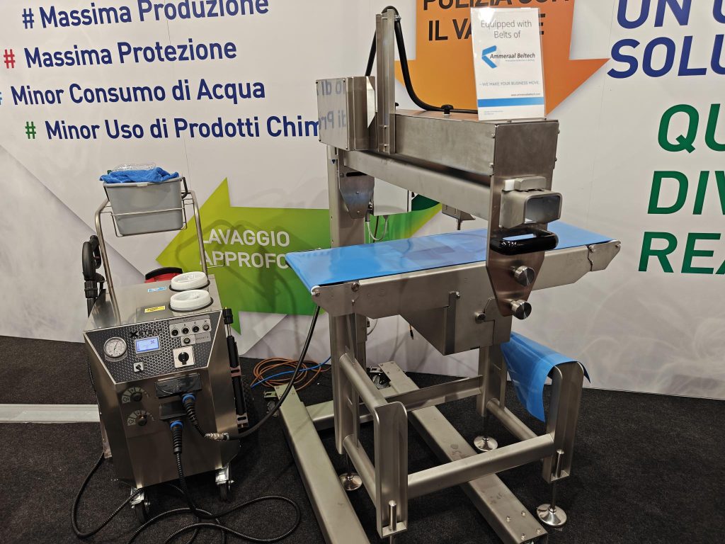 True innovation, however, emerges when mechanical design meets sanitation technology. This is where our collaboration with SteamItaly, an Italian company specializing in professional steam cleaning machines, comes in. By integrating their XSteam unit with our SaniBelt hygienic conveyor, we created a system that combines the bactericidal power of steam with the efficiency of a cleanable conveying process.