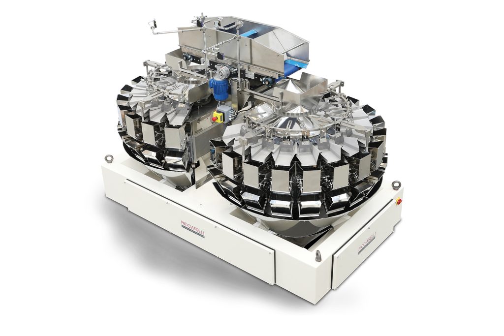 The multiheads weigher FCBS28TW from Ricciarelli consisting of two completely independent sectors, formed by 14+14 heads controlled by stepper motors arranged in a radial pattern with two discharge cones to feed twin packaging machines or cartoning machines with two loading points. The weighing machine is equipped with a product feed request signal generated by a photocell.